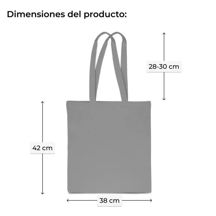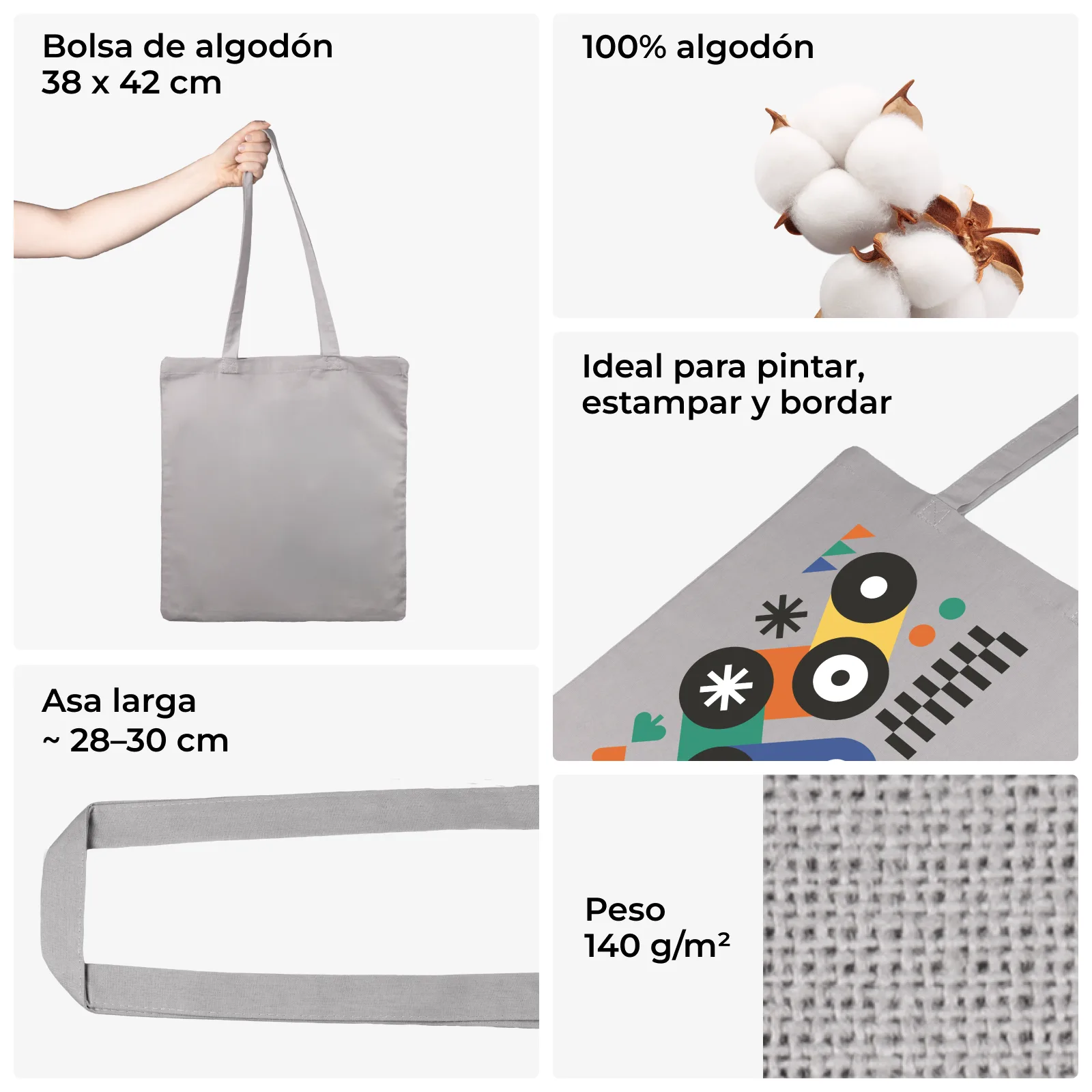 Bolsa de algodón de gran tamaño de 38 x 42 cm con un peso de 140 g. Esta bolsa de algodón ecológica tiene asas largas. En la oferta presentada se encuentra 1 producto.