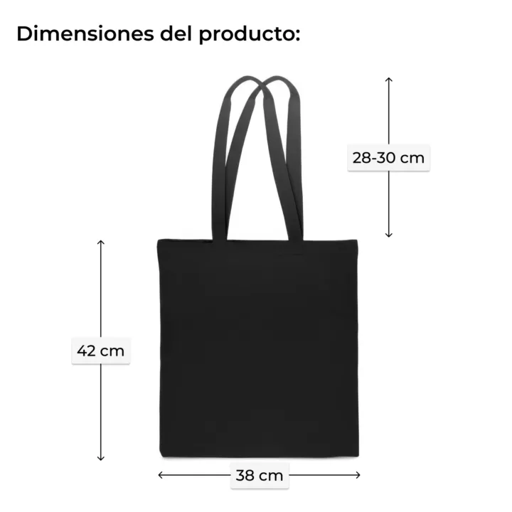 Gran bolsa de algodón reutilizable de 38 x 42 cm, con un peso de 140 g, destaca por su gran capacidad y sus asas largas, lo que la hace perfecta para el uso diario. El precio indicado es por 1 pieza; las bolsas se empaquetan individualmente. Puedes pedir una elegante bolsa negra sin estampados o optar por personalizar el producto: añadir una cita motivadora, un lema divertido o el nombre de tu banda favorita.