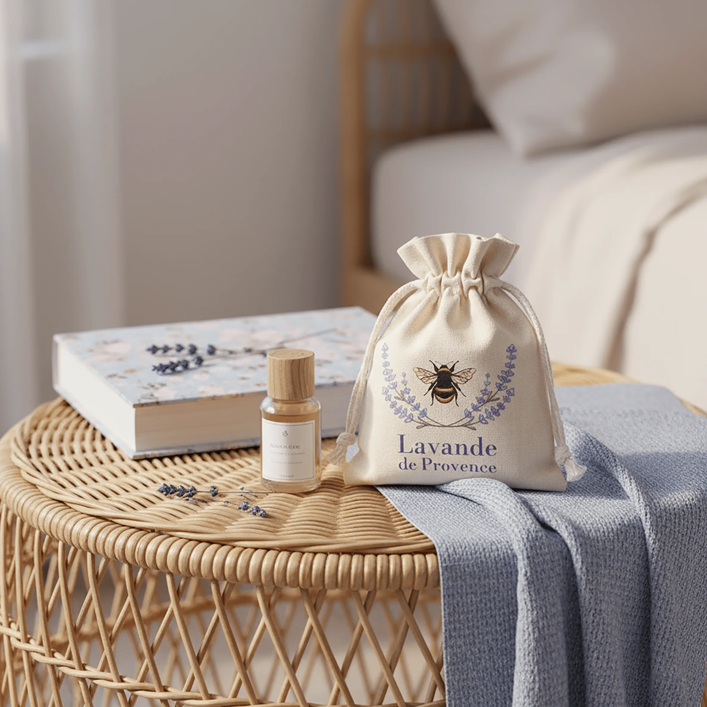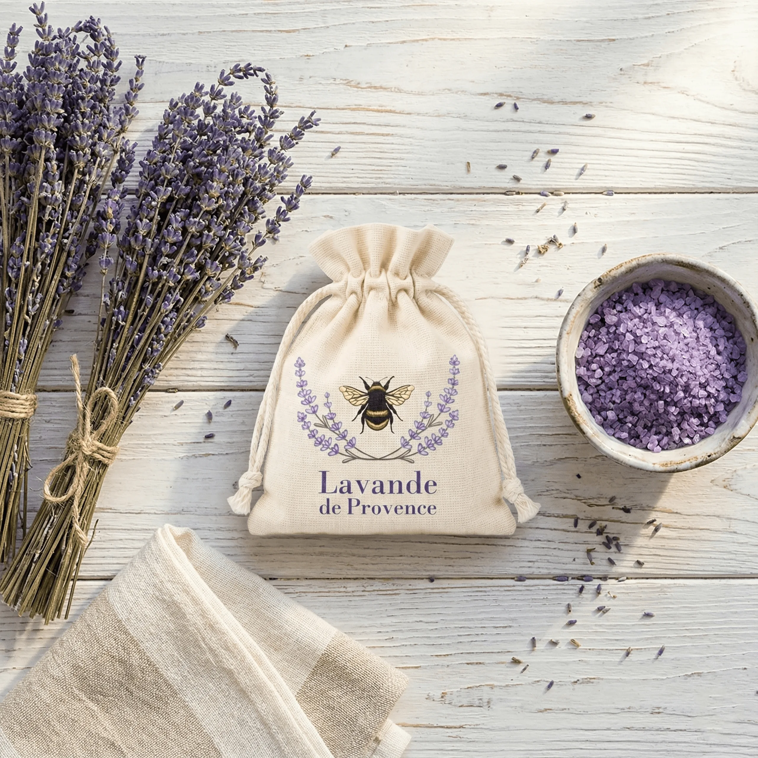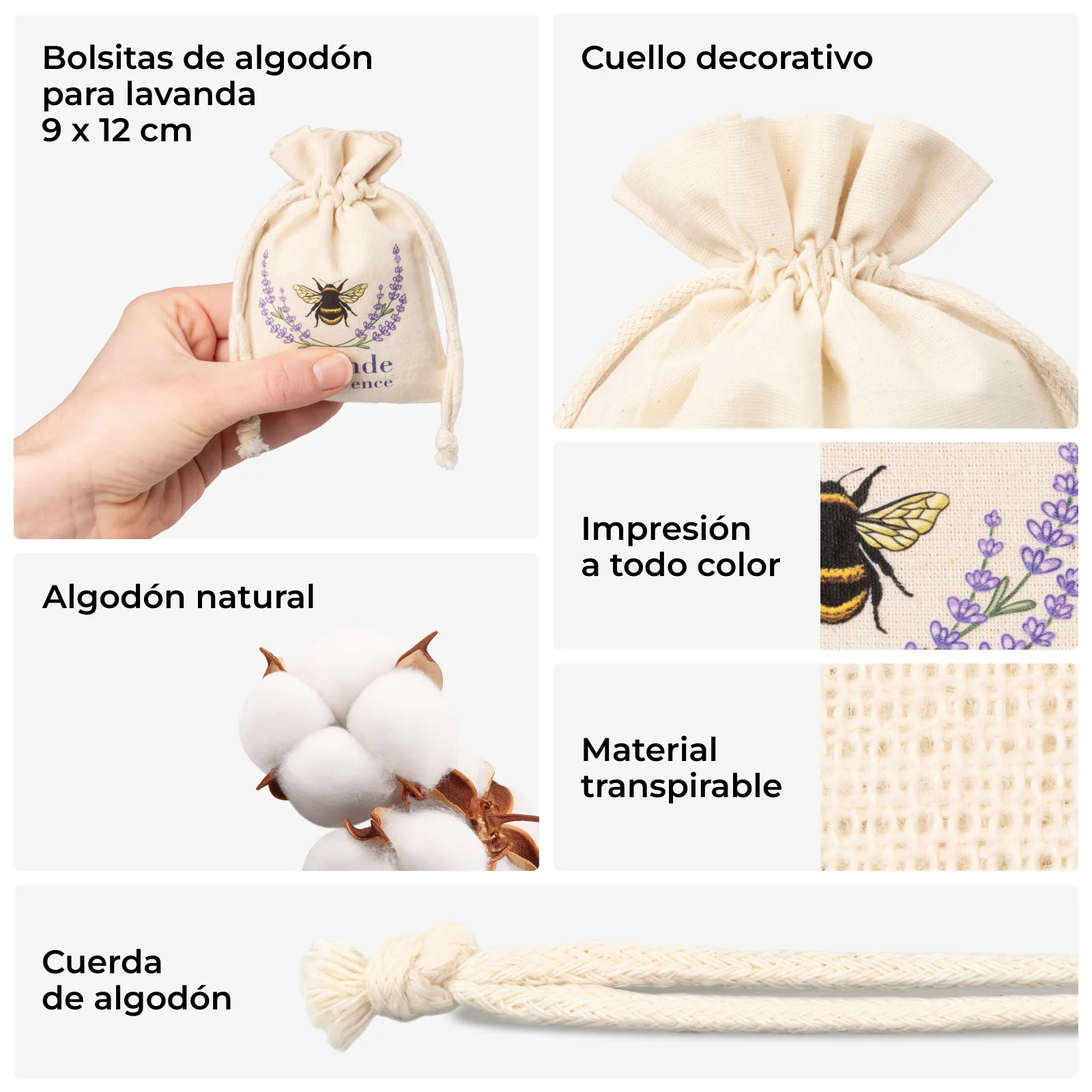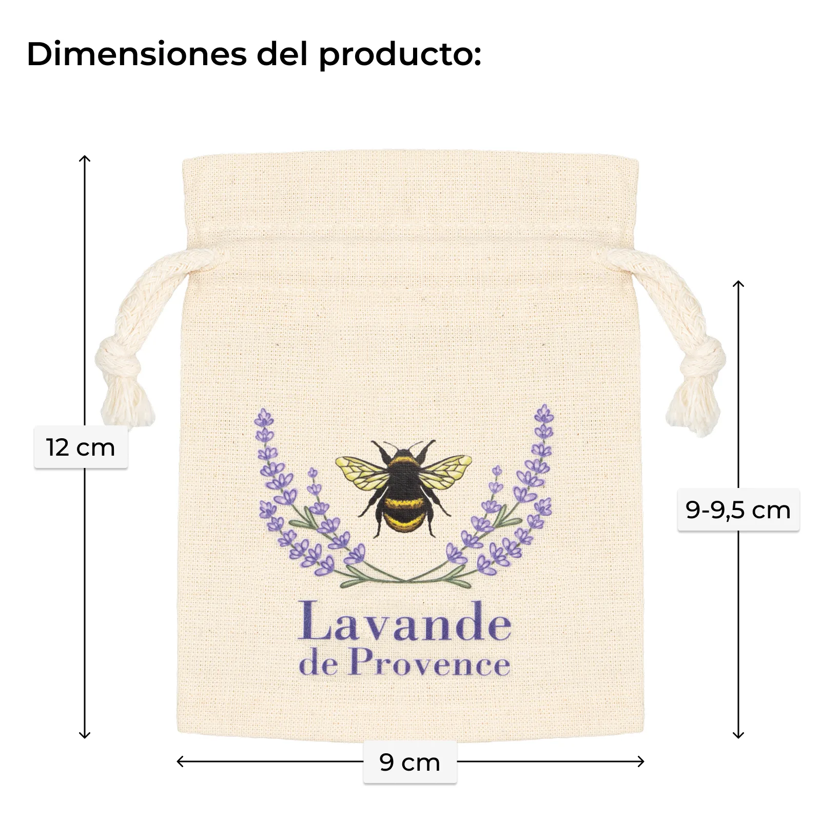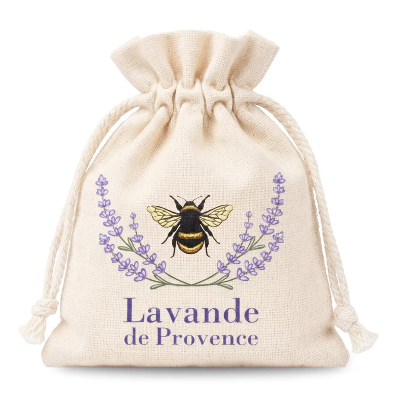 Estas bolsas de algodón para lavanda seca están confeccionadas con tejido de 100 % algodón en tono natural, ligeramente beige. La tela tiene una textura suave, sutilmente estructurada, y es transpirable, lo que aporta el aspecto de bolsa Provence algodón de estilo rústico. El color neutro resalta el diseño de la abeja y la lavanda y combina bien con cosmética sólida, productos artesanales o regalos regionales.