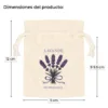 Estas bolsas están confeccionadas en 100 % algodón de color natural. El tejido tiene una textura agradable, ligeramente cruda, que deja pasar el aire y recuerda a las bolsas de algodón rústicas. El tono neutro crea un fondo discreto para el motivo violeta del ramo de lavanda con lazo.