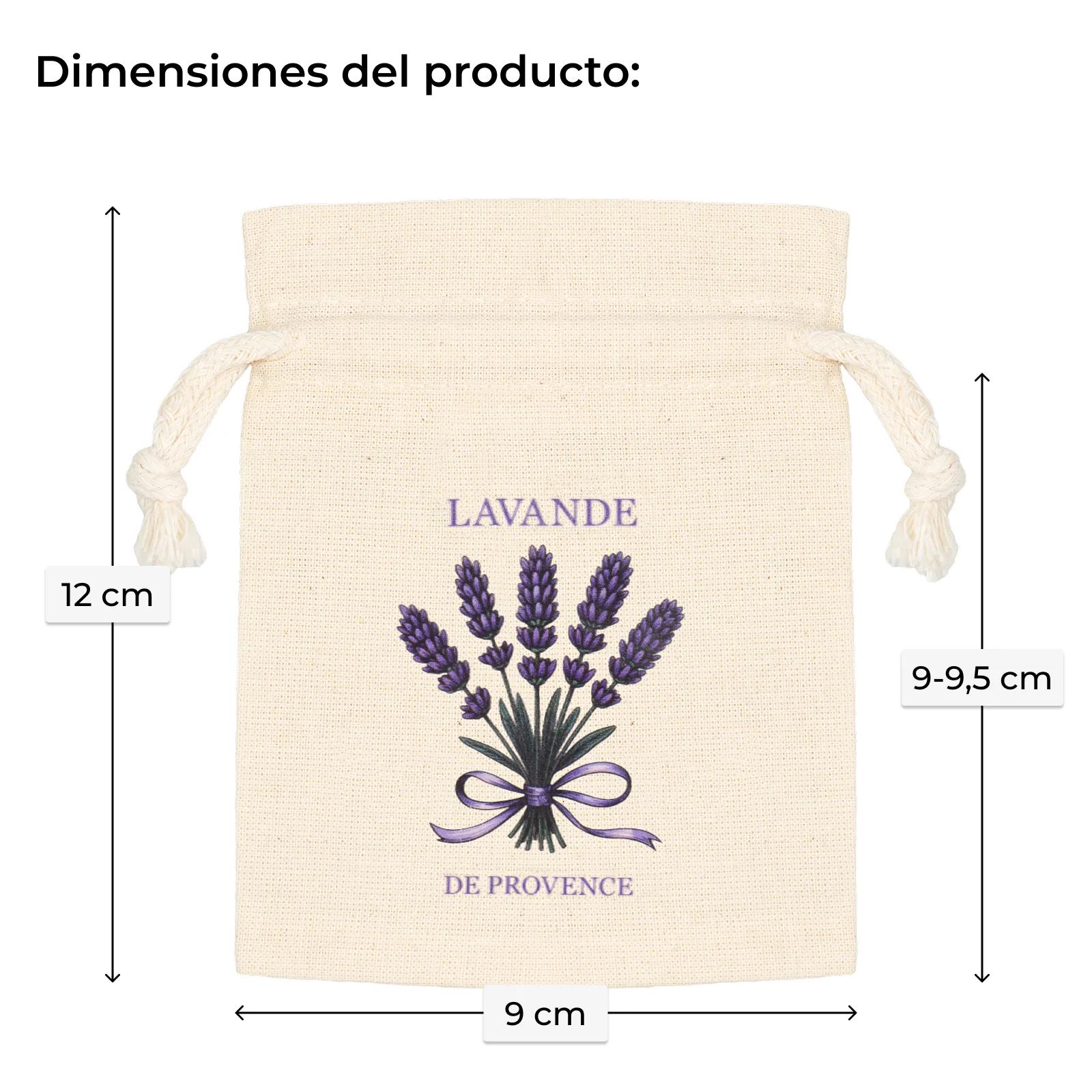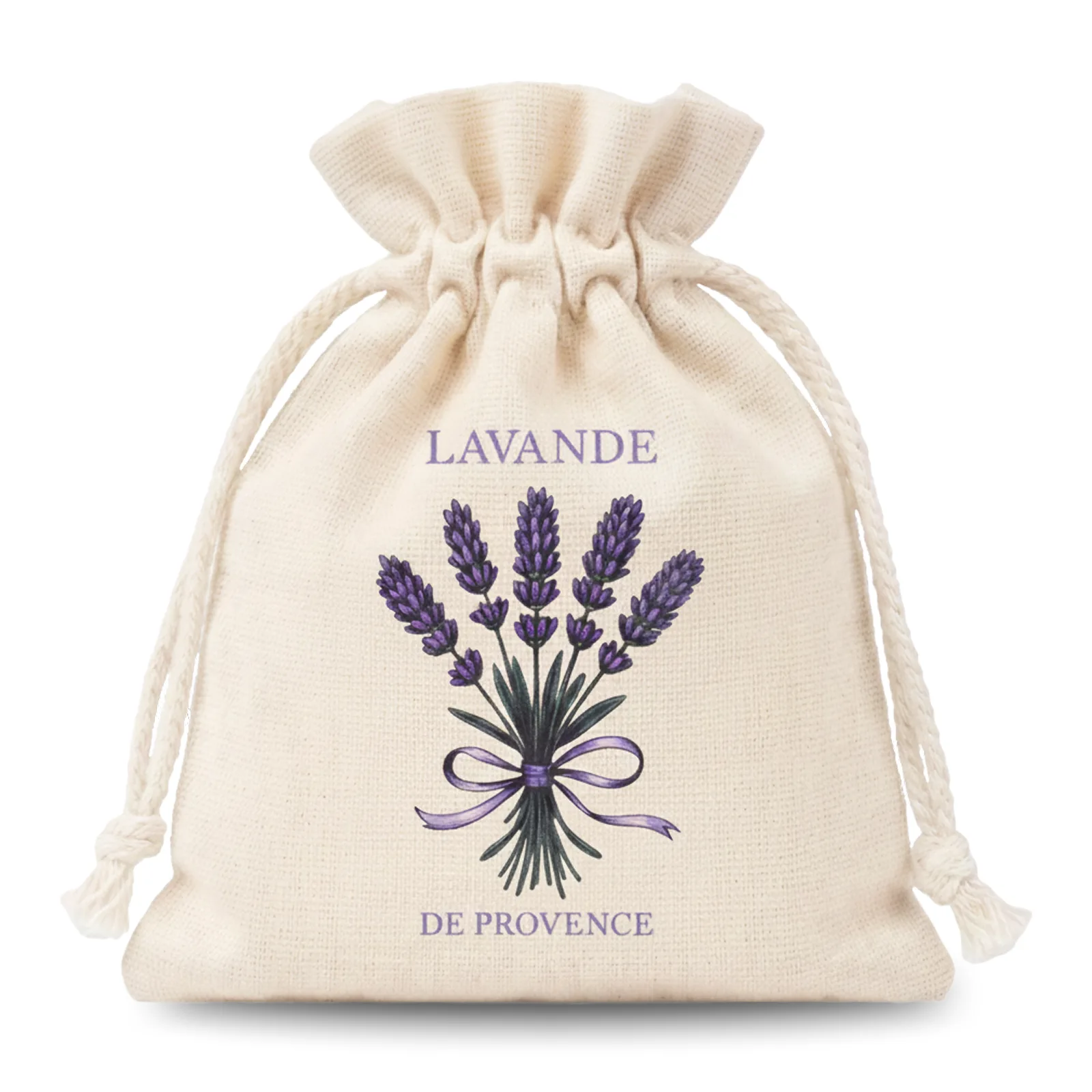 Las bolsas algodón natural Provence 9 x 12 cm son pequeños envases de estilo rústico, pensados para plantaciones de lavanda, marcas de cosmética natural y creadores de sets de regalo. El set incluye 10 bolsas de algodón 9 x 12 cm en color natural, con cuello decorativo sobre el cierre y cordón doble trenzado. Cada bolsa lleva un estampado de ramo de lavanda con el texto "Lavande de provance".
