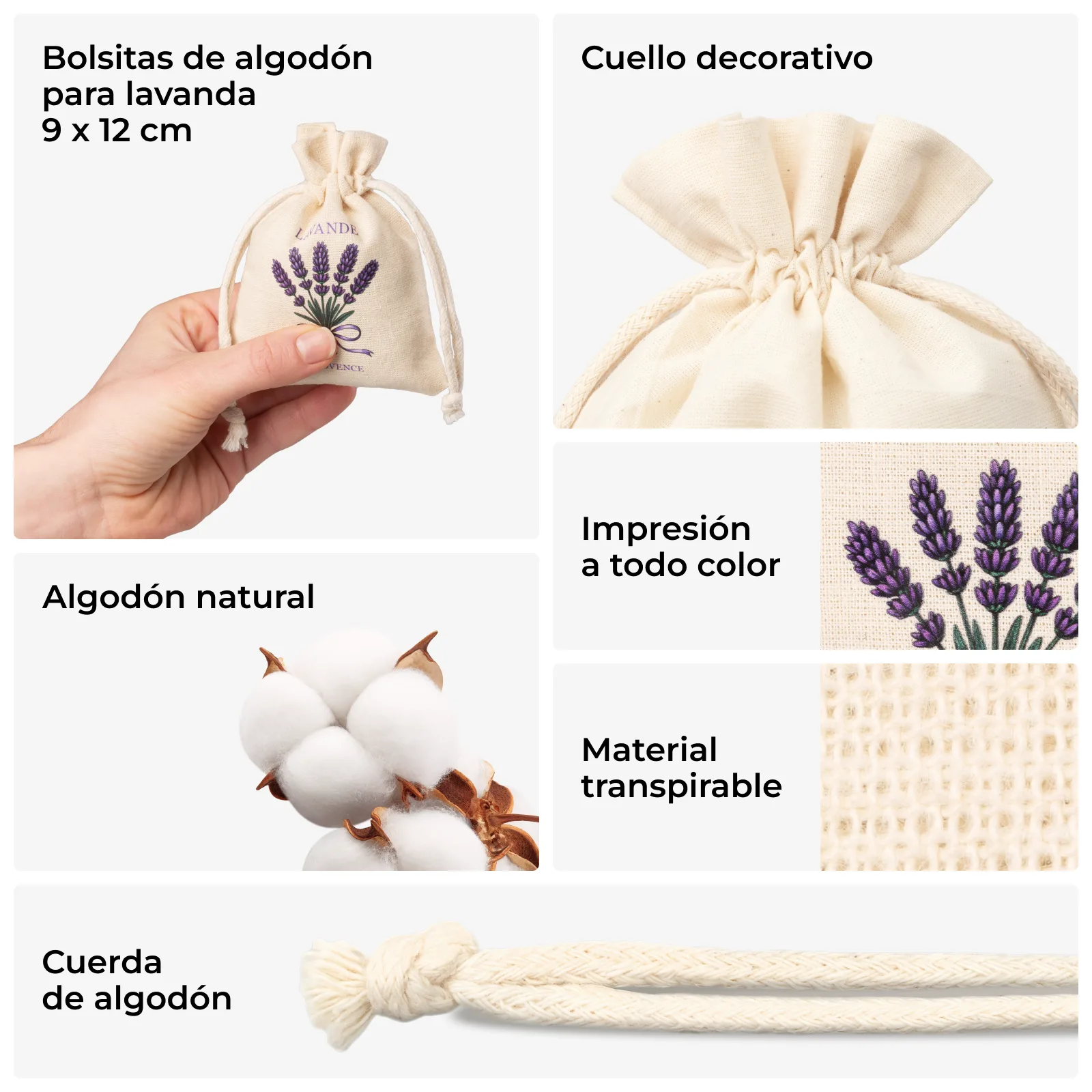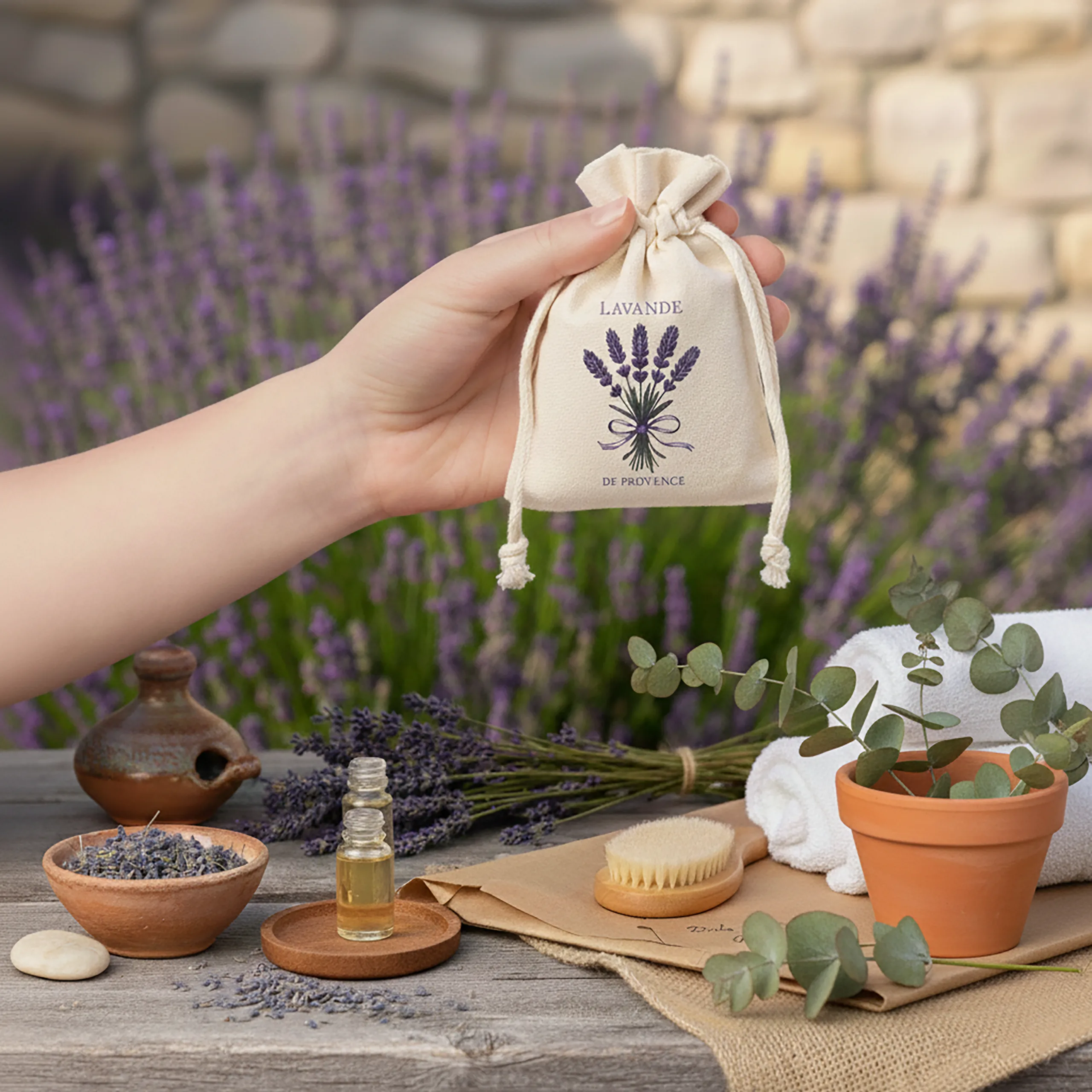 - como bolsas de algodón para lavanda seca en fincas y tiendas especializadas,