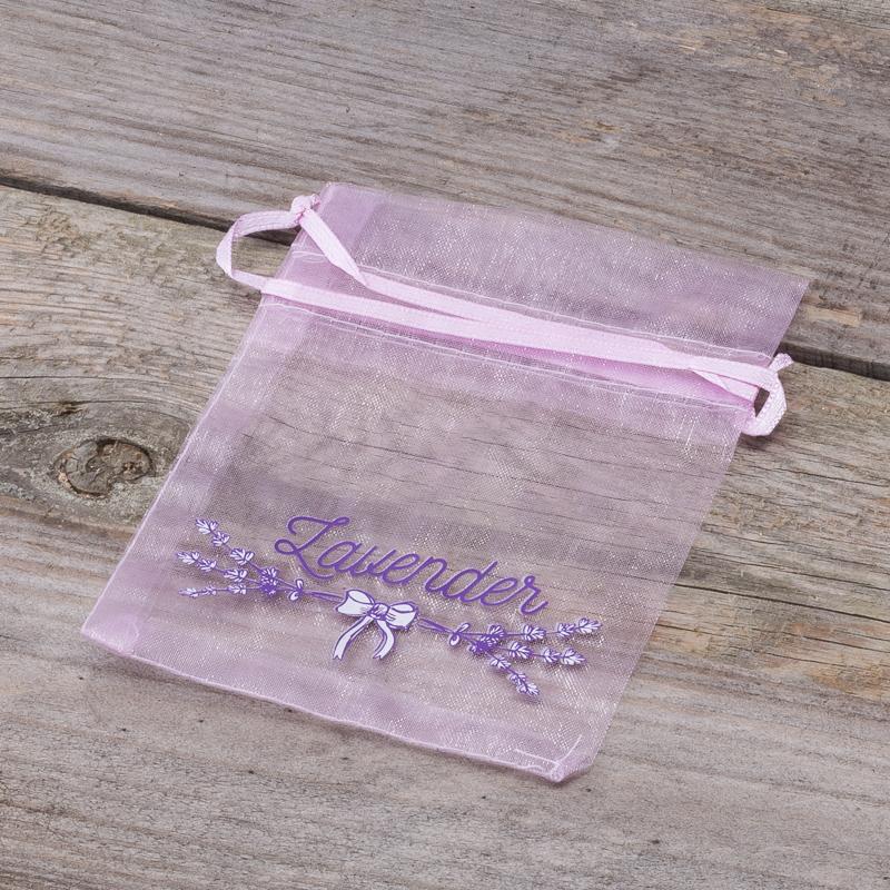 Conjunto de pequeñas bolsas de organza de dimensión 10 x 13 cm en el color violeta claro. Este conjunto práctico contiene 10 unidades , por lo cual, una sola compra sirve para mucho tiempo. ¡Esta oferta presenta bolsas con impresión de lavanda!
