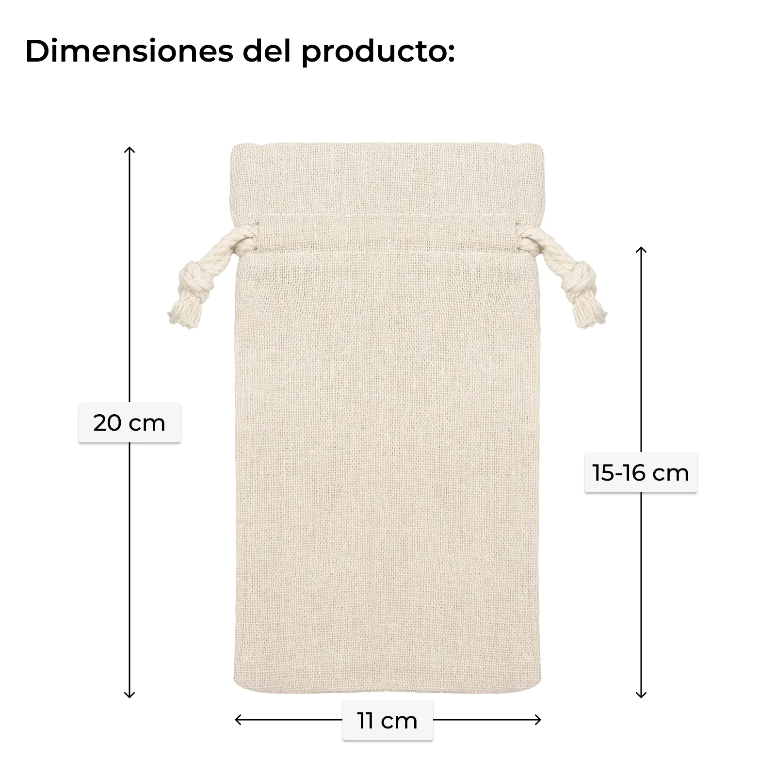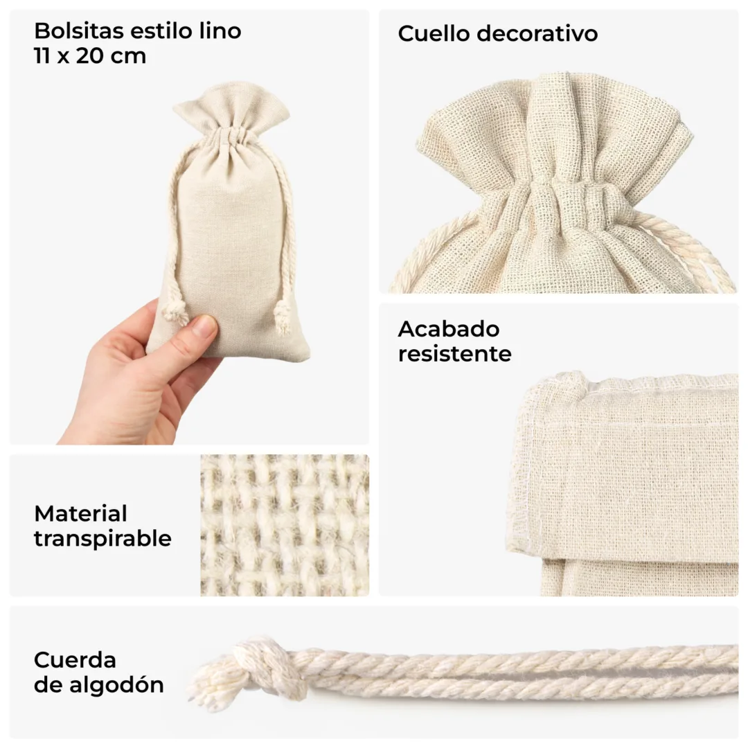 Descubre las duraderas y prácticas bolsas de tela en el color del lino natural. Las bolsas pequeñas que se presentan aquí miden 11 × 20 cm. El paquete incluye un set de 10 unidades de saquitos universales.