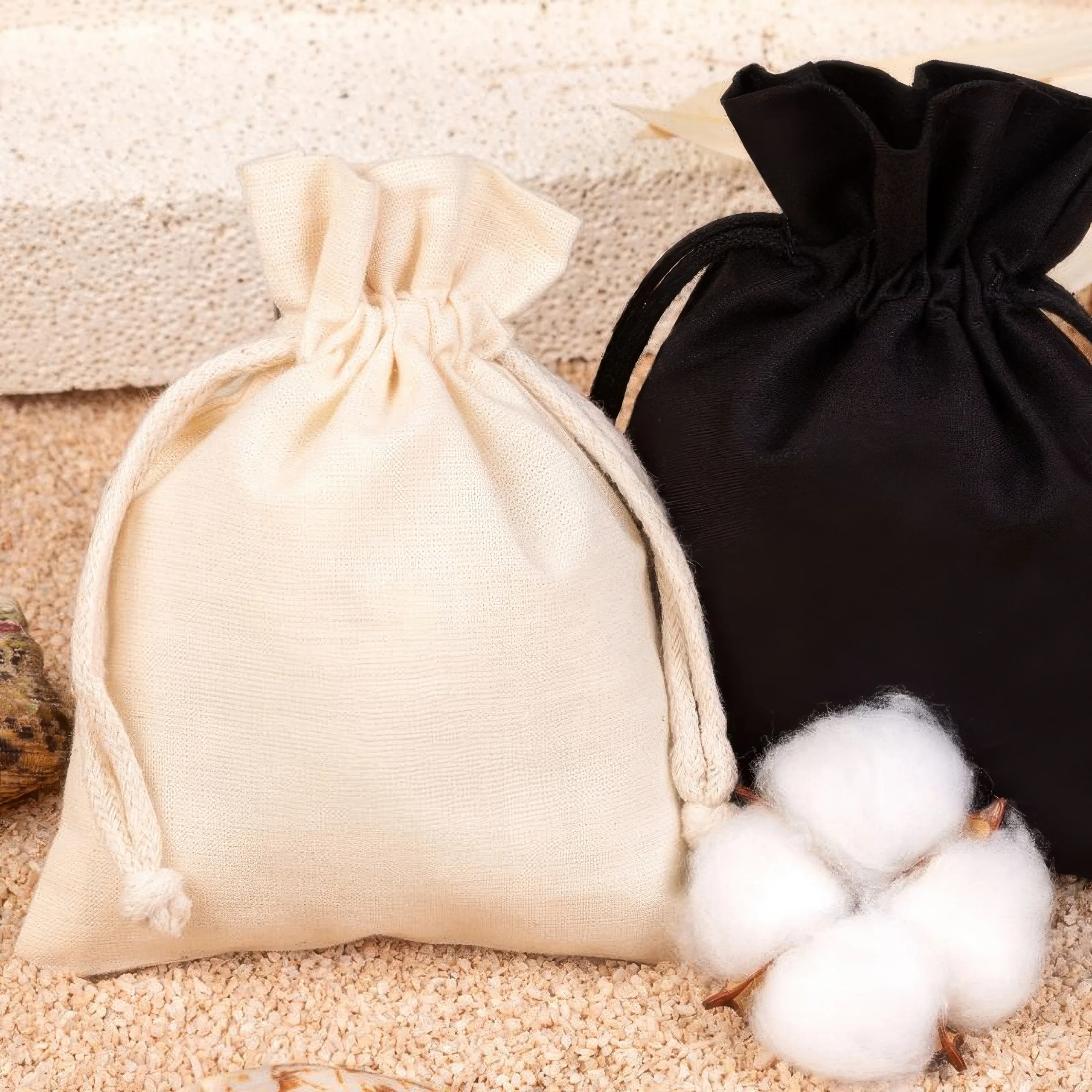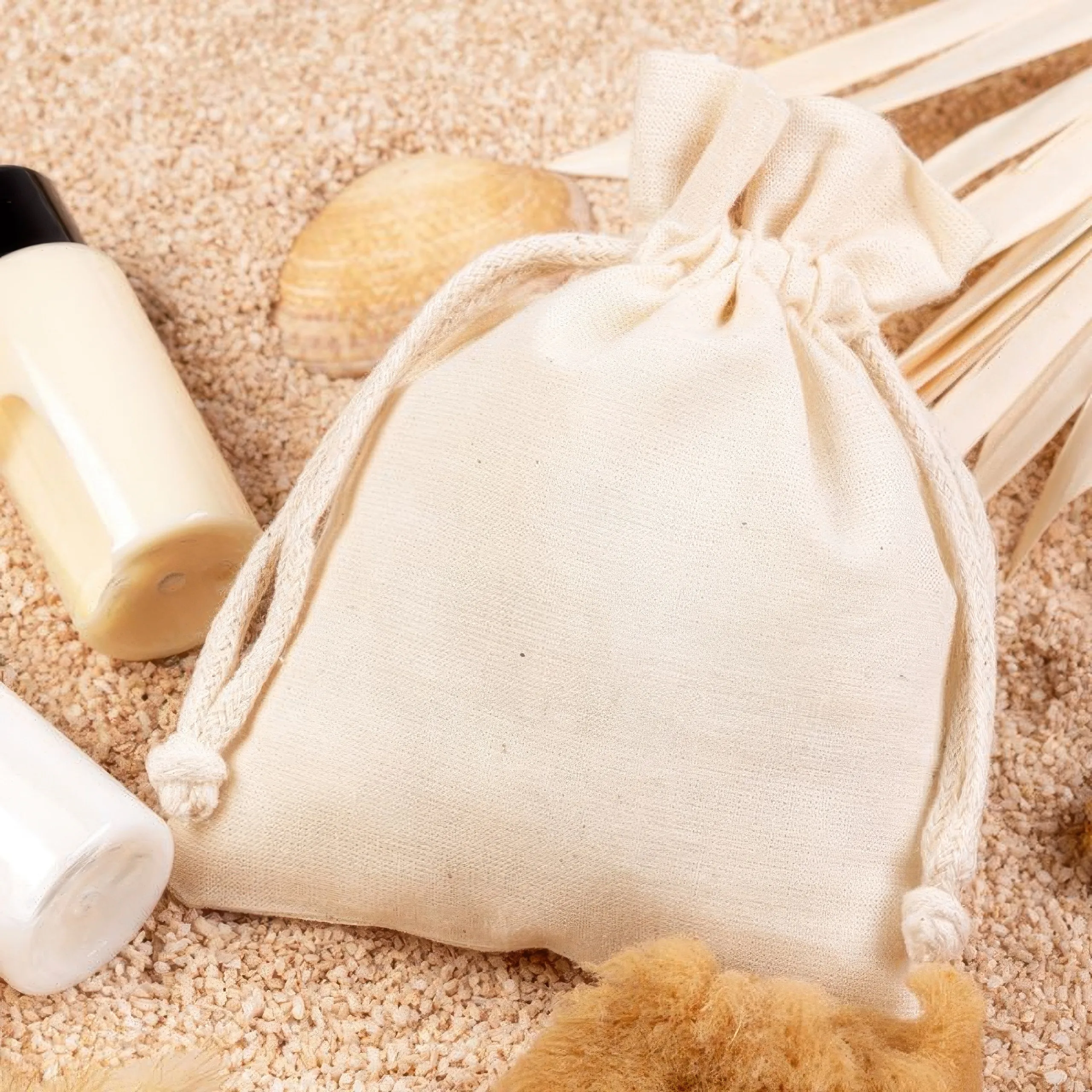 El tono natural combina fácilmente con distintos estilos de marca - desde productos artesanales hasta sets promocionales - y encaja bien en presentaciones minimalistas. El cordón doble de algodón, que se tira desde ambos lados, ayuda a mantener el contenido bien recogido y aporta un aspecto visualmente equilibrado al cierre de la bolsa.