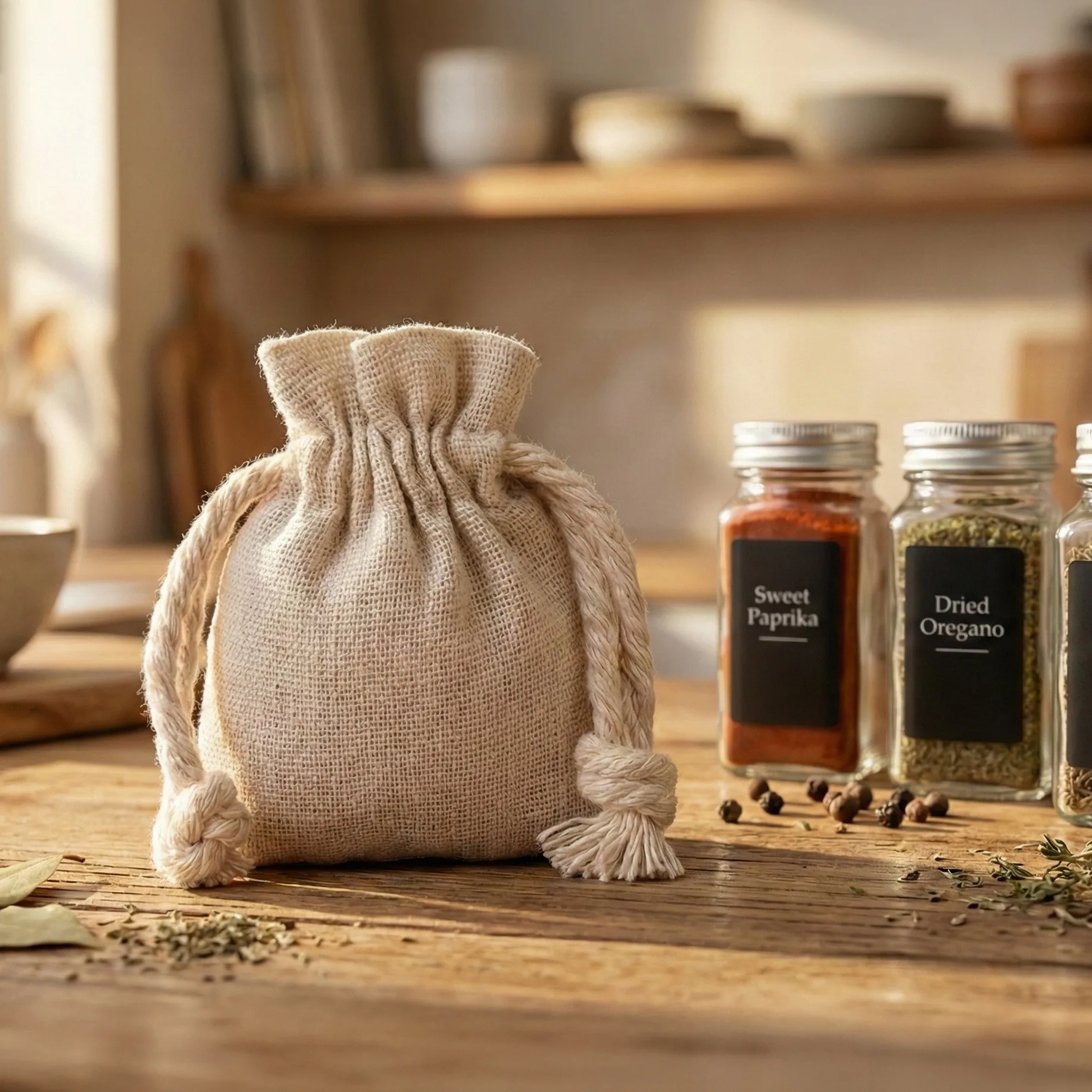 Estas bolsitas se fabrican con un tejido mixto de algodón y poliéster que aporta el aspecto del lino con mayor resistencia frente al uso diario. El material es transpirable y agradable al tacto, y se arruga menos que el lino natural. El tono beige natural y la textura visible combinan bien con propuestas de packaging de estilo rústico, boho o minimalista. El doble cordón de algodón, con trenza decorativa, garantiza un cierre estable y ordenado.