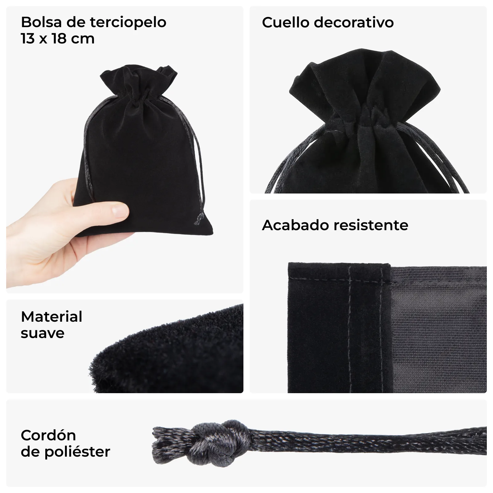 Los bolsos de terciopelo se destacan por su apariencia de lujo y elegancia. El color negro les da un toque de clase y los convierte en el envoltorio perfecto para cualquier ocasión. Pueden ser usados para empacar joyería, cosméticos o regalos, dándoles un carácter único.