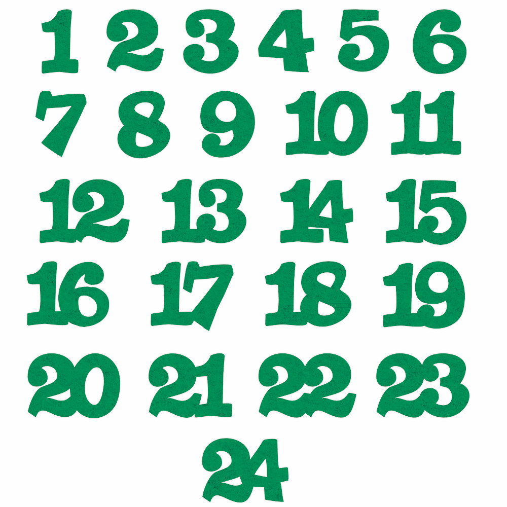 Ofrecemos un conjunto de pegatinas de fieltro para crear un calendario de adviento en color verde con una altura de 4 cm (el ancho dependerá del número elegido). En el conjunto encontrarás 24 números autoadhesivos de fieltro, del 1 al 24. ¡Con ellos podrás crear una decoración navideña original de manera sencilla!