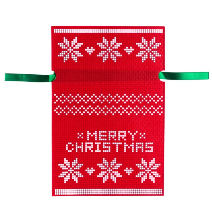 Estas bolsas non woven navideñas de 20 x 30 cm combinan diseño llamativo, durabilidad y funcionalidad. Están decoradas con un estampado blanco a doble cara en estilo "jersey navideño" y se cierran con una cinta verde brillante. Son una alternativa elegante y reutilizable frente a las tradicionales bolsas de papel o plástico, perfectas para marcas que quieren destacar durante la campaña navideña.