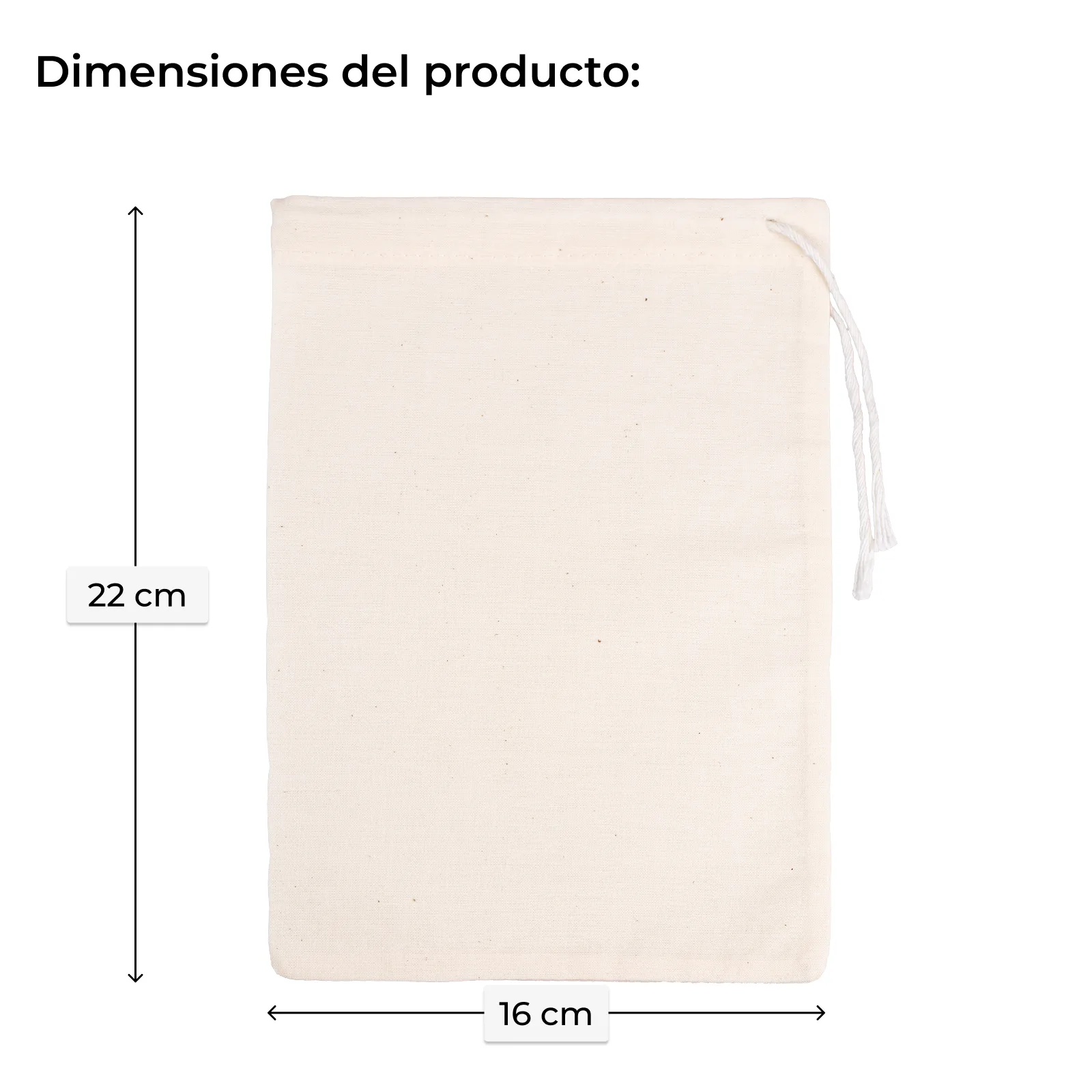 Te ofrecemos un pack de 5 bolsas de algodón de 16 × 22 cm, confeccionadas en 100% algodón natural en tono beige. Se trata de un modelo sin dobladillo, con cierre de cordón sencillo en un lateral. Son económicas y sostenibles, reutilizables y perfectas para quienes valoran la sencillez, la estética y un estilo de vida zero waste. Resistentes, funcionales y listas para múltiples usos, tanto en casa como en el ámbito profesional.