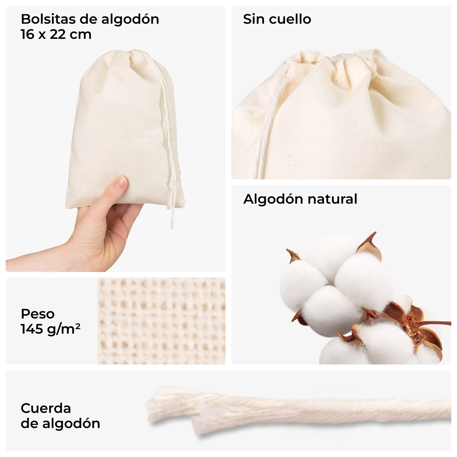 - Ecológicas: 100% algodón natural, alternativa sostenible al plástico,
