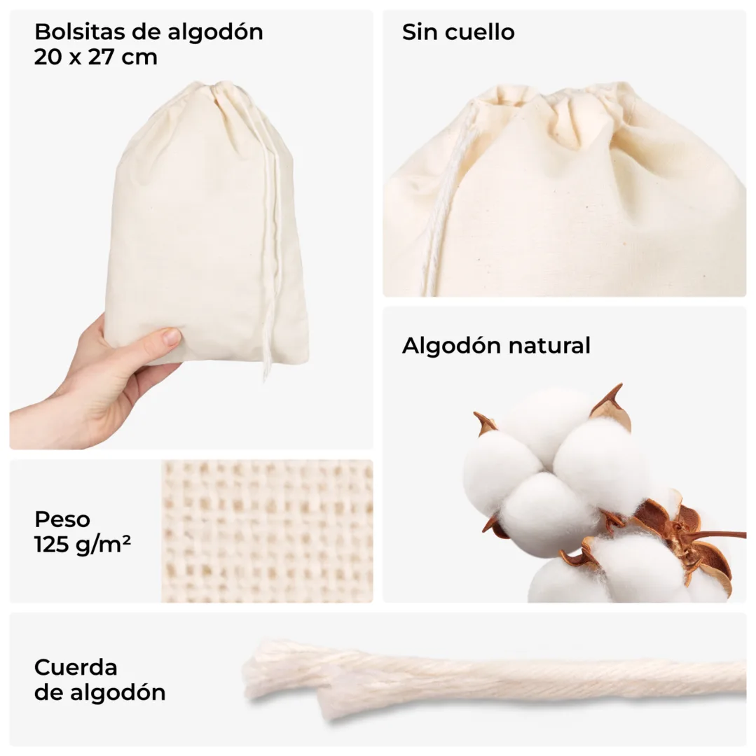 Las bolsitas de algodón son ideales para almacenar alimentos como pan, frutas y verduras. También son perfectas para envolver regalos, guardar ropa, organizar materiales de manualidades o decorar espacios con un toque natural.