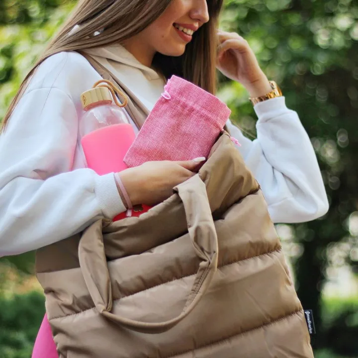 Un conjunto de 5 bolsas de yute glamurosas en el color rosa claro y dimensión de 18 x 24 cm. Te animamos también a fijarte en otras posibilidades: también ofrecemos bolsas de yute en otras versiones de color.