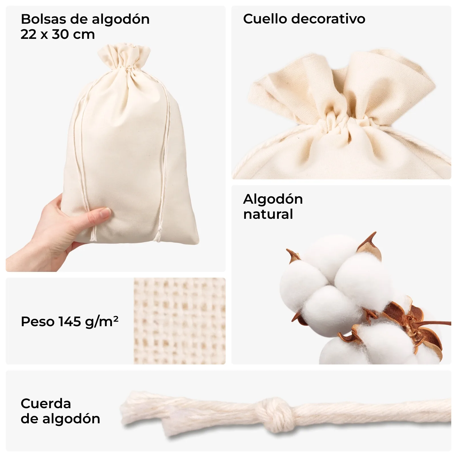 Nuestras bolsas de algodón están fabricadas con tejido natural, sin teñir, resistente y transpirable. Son reutilizables y lavables, ideales para marcas que apuestan por el consumo responsable y el packaging sostenible.