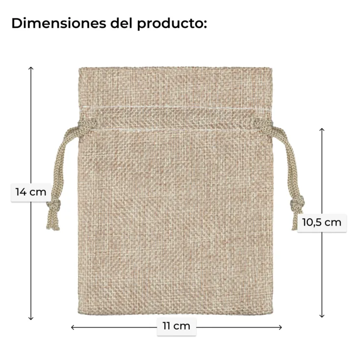 10 unidades de bolsas de yute de color natural y dimensión 11 x 14 cm.