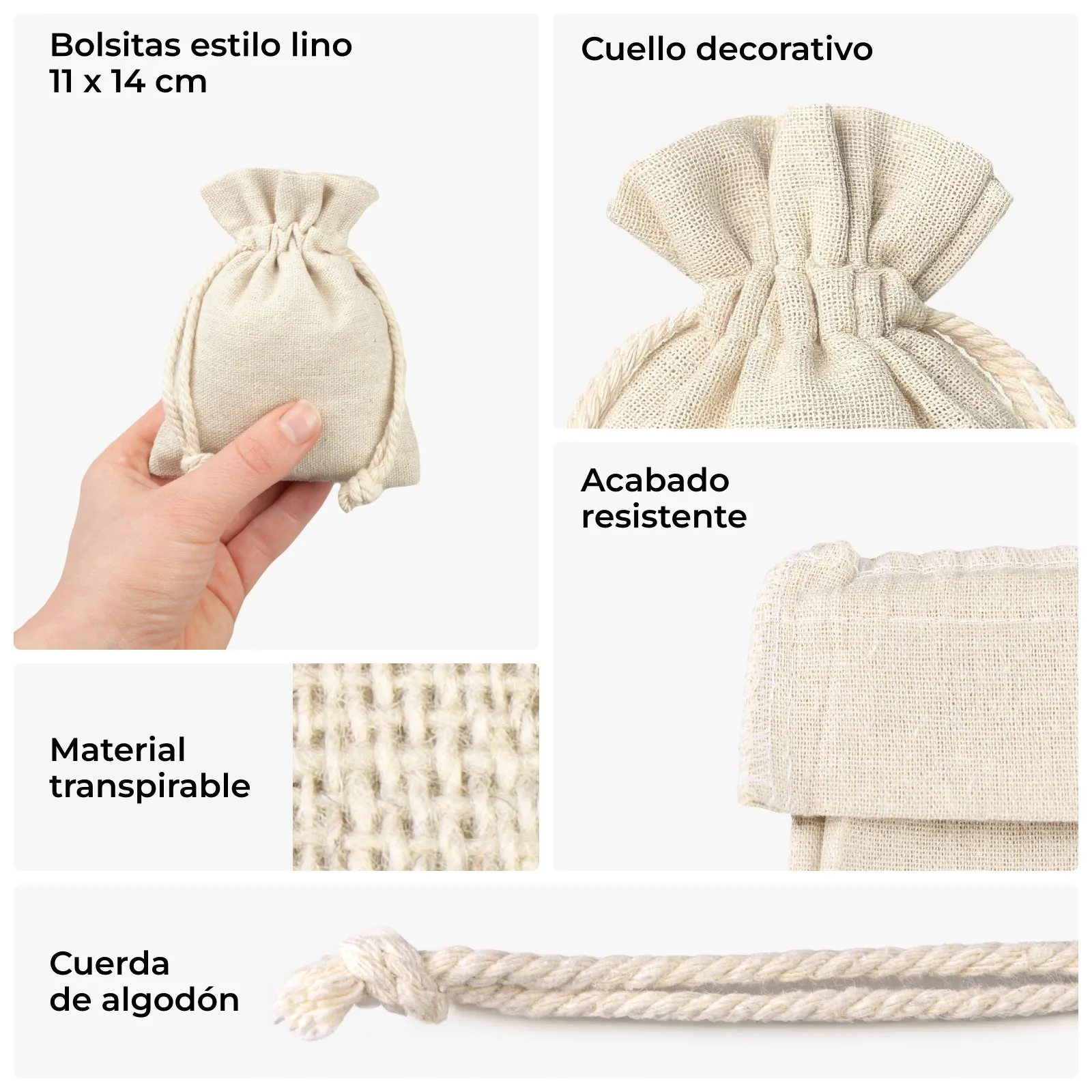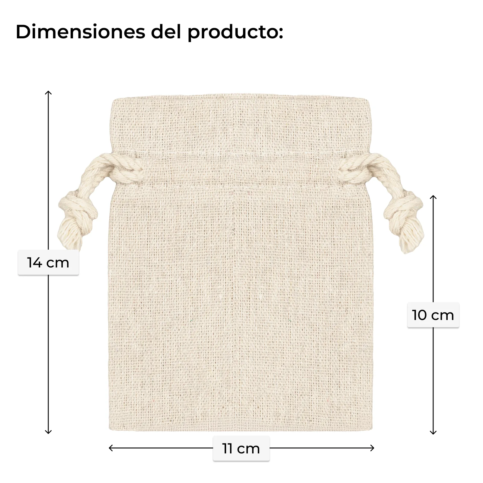 Descubre las duraderas y prácticas bolsas de tela en el color del lino natural. Las bolsas pequeñas que se presentan aquí miden 11 x 14 cm. El paquete incluye un set de 10 unidades de saquitos universales.