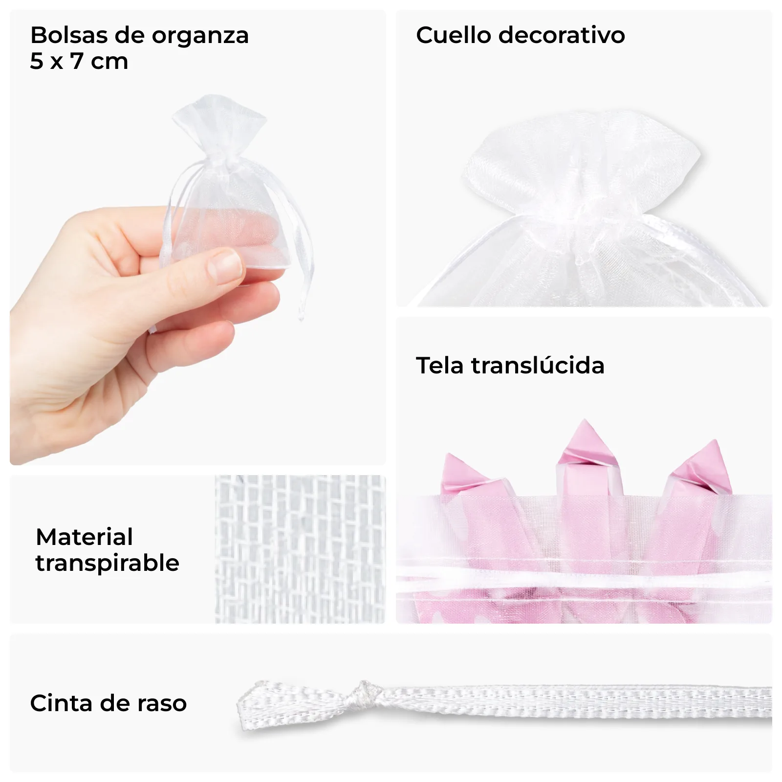 Organza es una tela translúcida con una estructura muy ligera, que no sólo luce elegante, sino también, más allá de las apariencias, es muy fuerte. Por esto, bolsas hechas de organza son una solución práctica para almacenamiento de artículos pequeños por mucho tiempo.