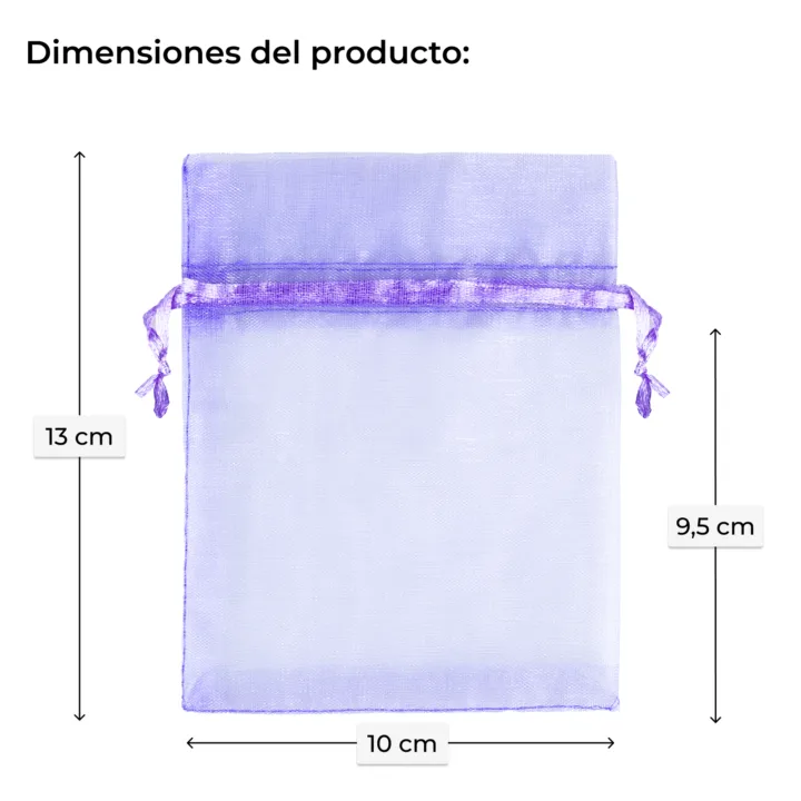 Las bolsas de organza para lavanda seca en tamaño 10 x 13 cm son envases elegantes, prácticos y reutilizables que pueden contener aproximadamente 20 g de flores de lavanda seca. El pack incluye 25 unidades de color violeta, hechas de organza con un aspecto sutil y elegante, un cuello decorativo sobre el cordón y un doble lazo de satén para el cierre.