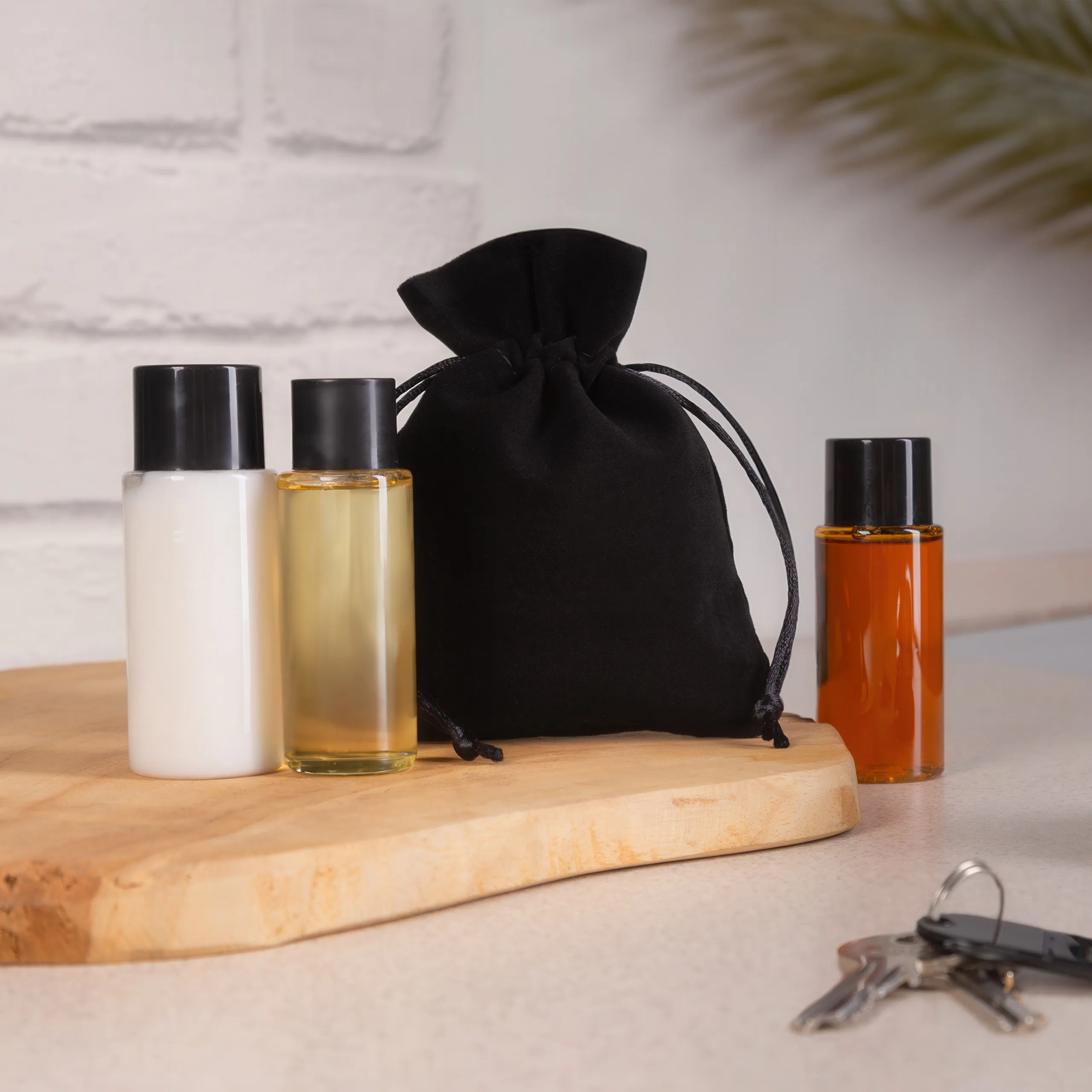 Ofrecen un acabado elegante, tacto suave y buena durabilidad. El color negro combina bien con productos premium y destaca especialmente joyería y pequeños detalles. El cierre con doble cordón facilita el uso diario y permite reutilizarlas muchas veces. Son una opción versátil para marcas y particulares que buscan un embalaje pequeño, estético y funcional.