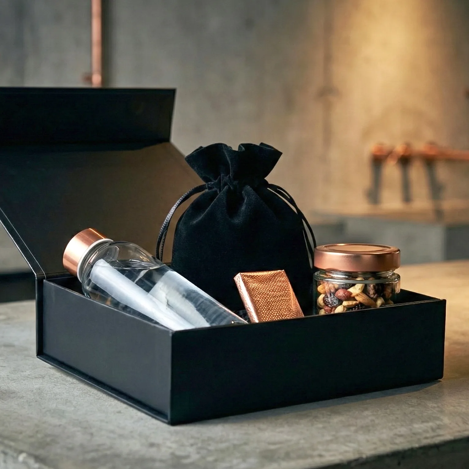 El terciopelo utilizado tiene un tacto suave y una textura aterciopelada que refleja ligeramente la luz, realzando el tono negro y aportando un aspecto refinado. La estructura del tejido ayuda a proteger el contenido frente a pequeñas marcas o arañazos, lo que lo hace adecuado para artículos delicados. A pesar de su suavidad, el material mantiene bien la forma y resulta práctico para un uso frecuente.