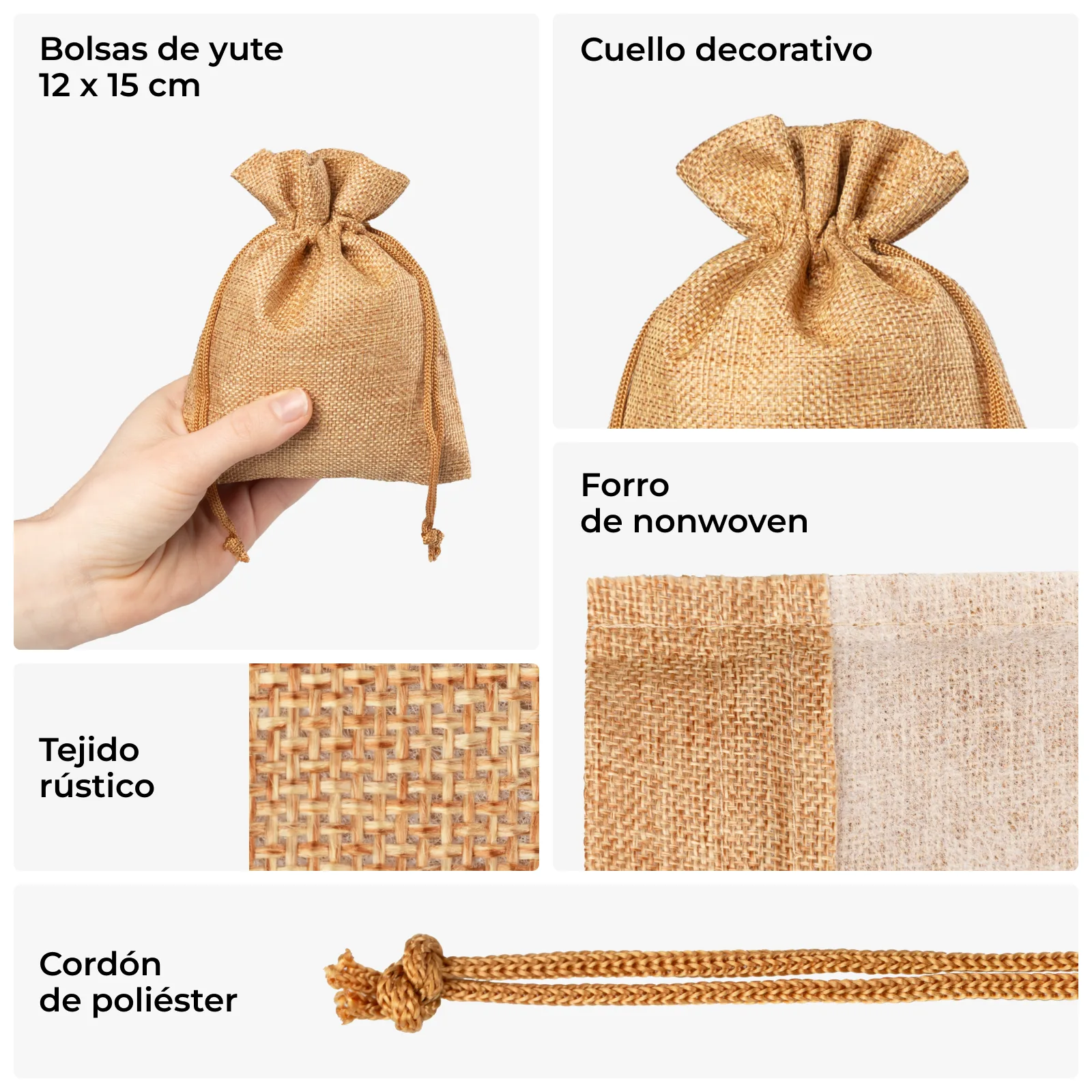 El conjunto incluye 10 unidades de bolsitas resistentes de yute sintético, que es resistente a los daños mecánicos y a las arrugas. Los sacos pequeños de tela que imitan el yute son organizadores populares para guardar café, té, semillas y otros productos a granel. El práctico cordón de cierre garantiza un manejo sencillo y, al mismo tiempo, hace que el saquito de material que imita el yute tenga un aspecto elegante y combine con la decoración escandinava, rústica o vintage. Este saco pequeño también resulta útil para viajar, para guardar un powerbank, cosméticos, medicamentos o snacks. Su aplicación es prácticamente ilimitada, por lo que nuestras bolsitas de tela estilo yute son productos universales y multifuncionales.