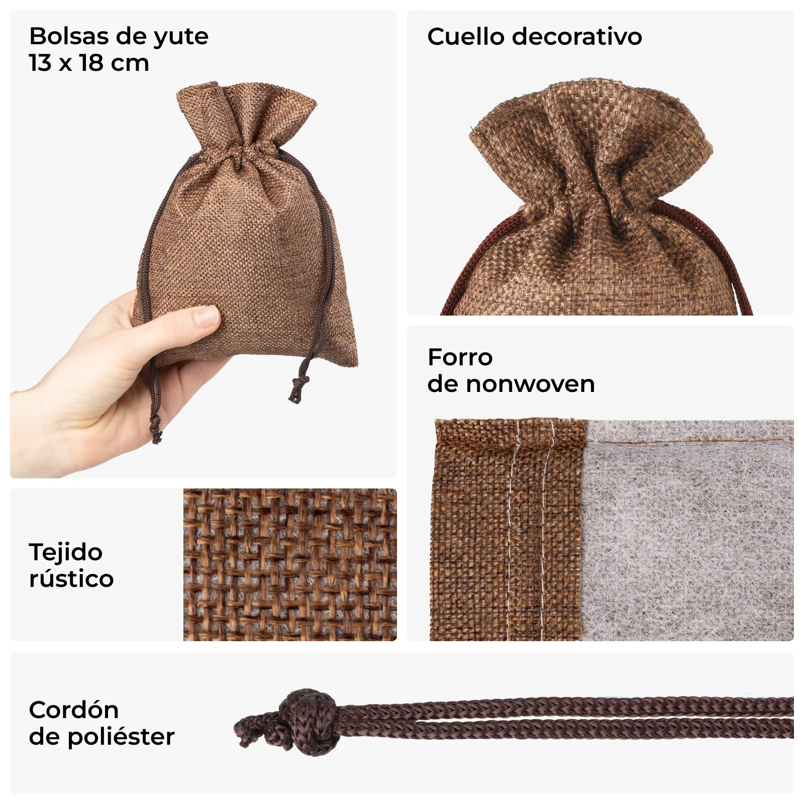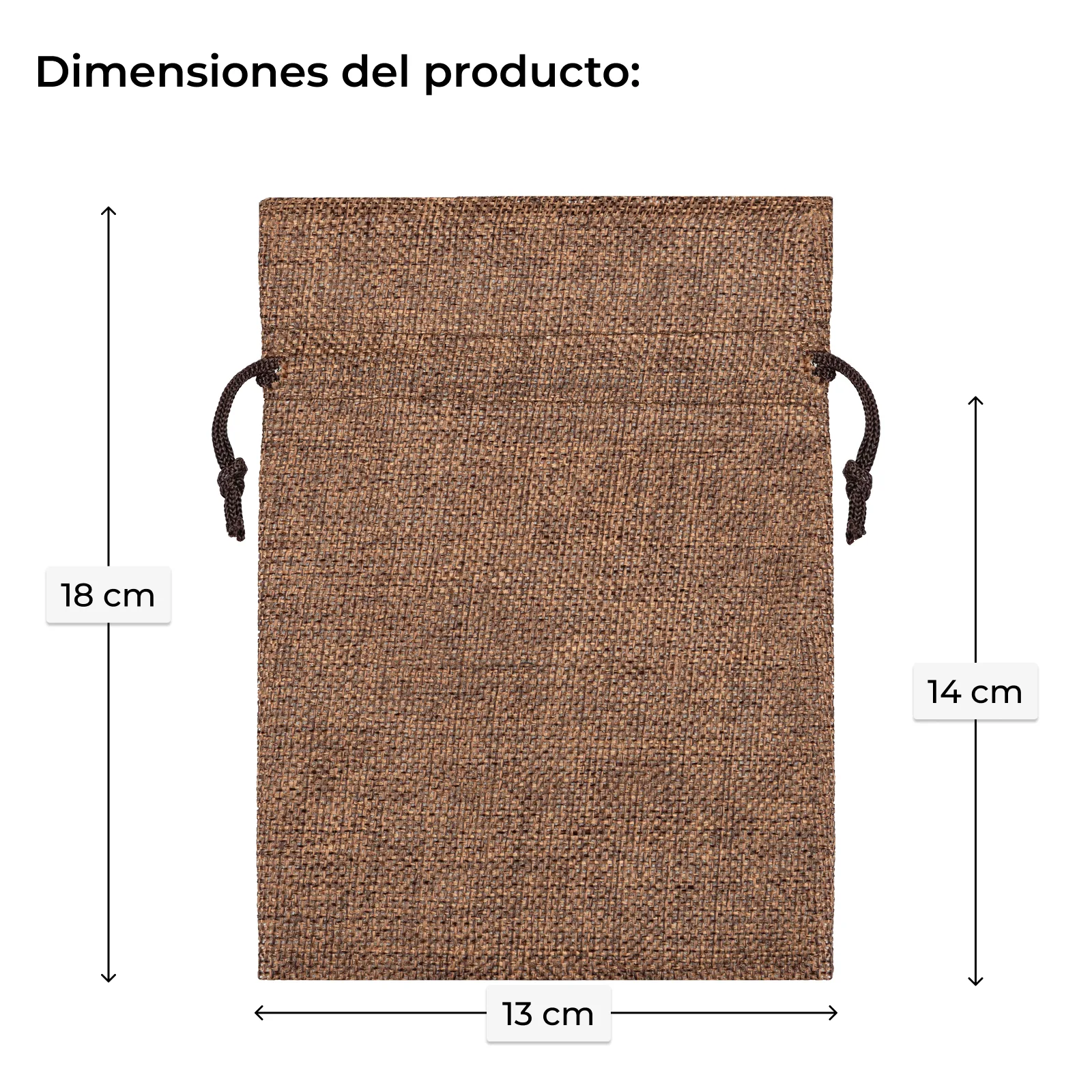 10 unidades de bolsas de yute de color natural oscuro y dimensión 13 x 18 cm.