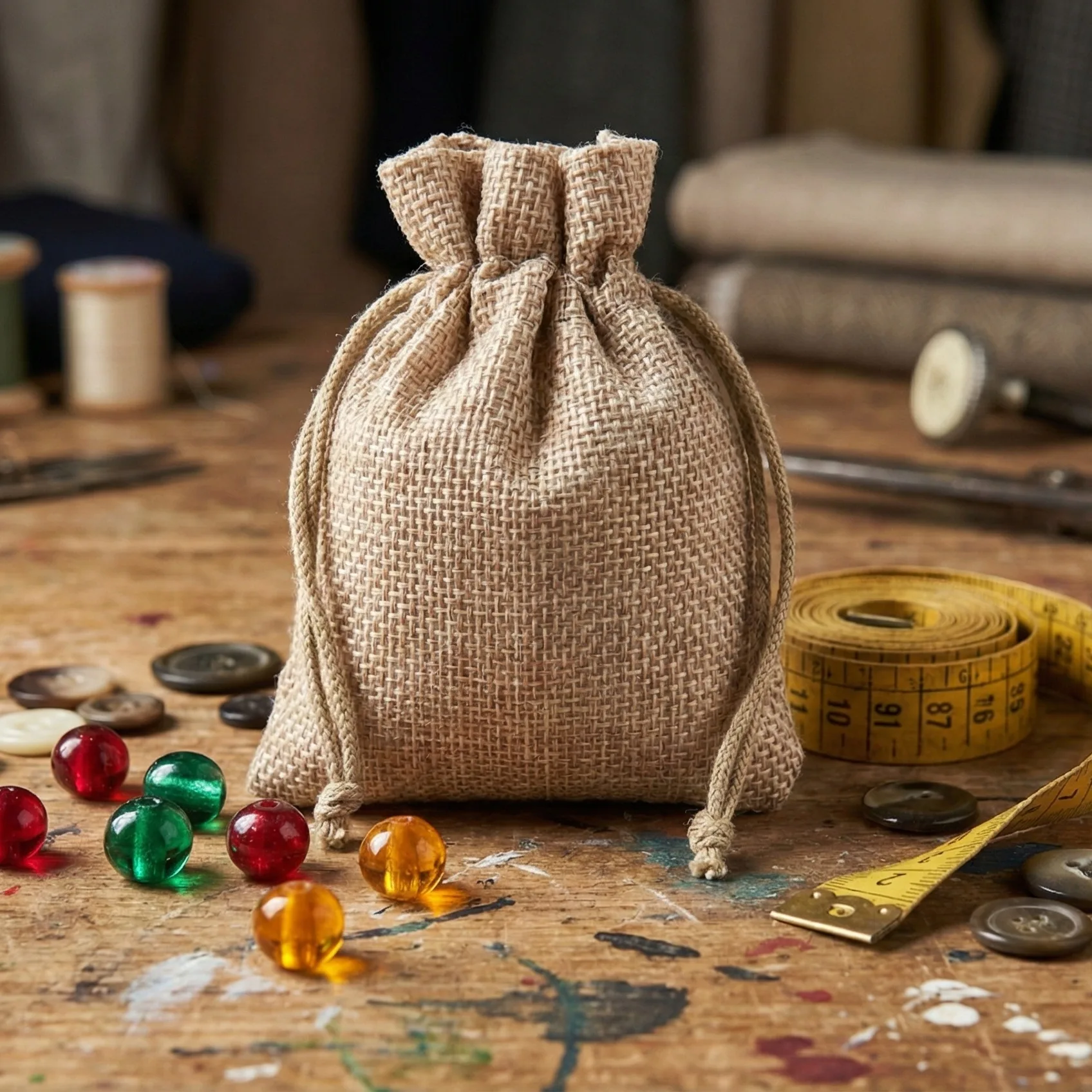 En el hogar, estas bolsas de yute pequeñas son prácticas como envoltorio para pequeños regalos para invitados, como bolsitas decorativas para detalles en la mesa o como organizadores para joyas, abalorios y pequeños accesorios. Su tamaño compacto permite guardar fácilmente los objetos que suelen perderse en cajones.