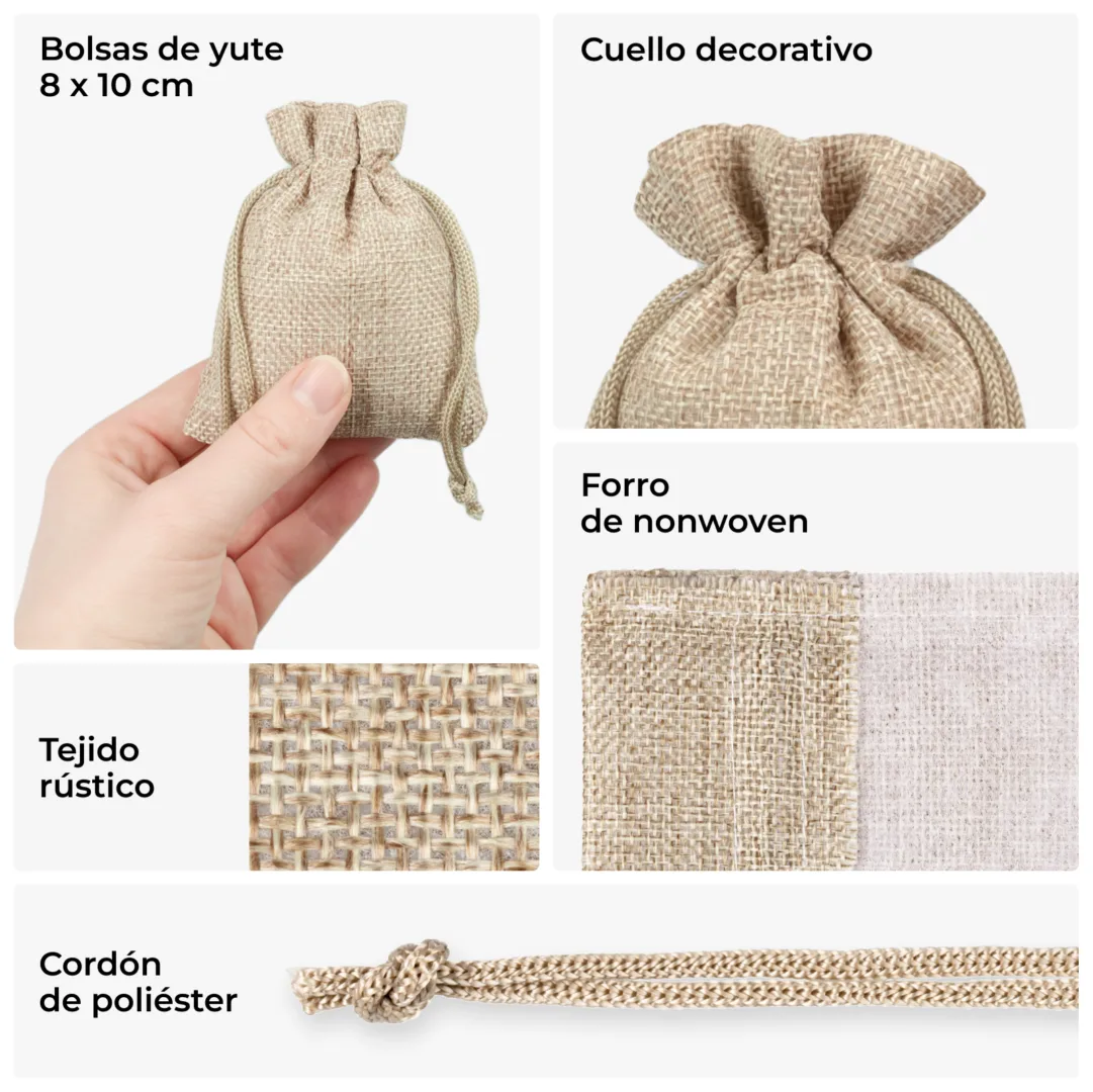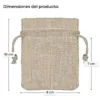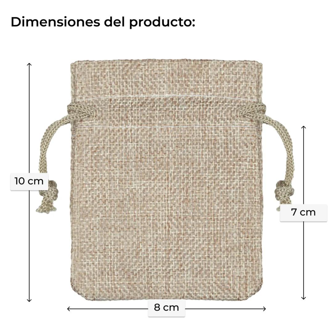 Pequeñas y muy versátiles bolsas de yute elegantes en color natural y dimensiones de 8 x 10 cm. El paquete incluye 10 unidades, por lo tanto, una sola compra te servirá durante mucho tiempo.